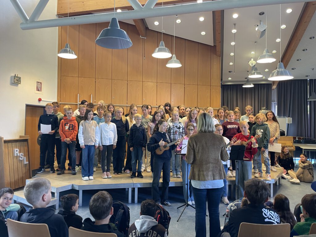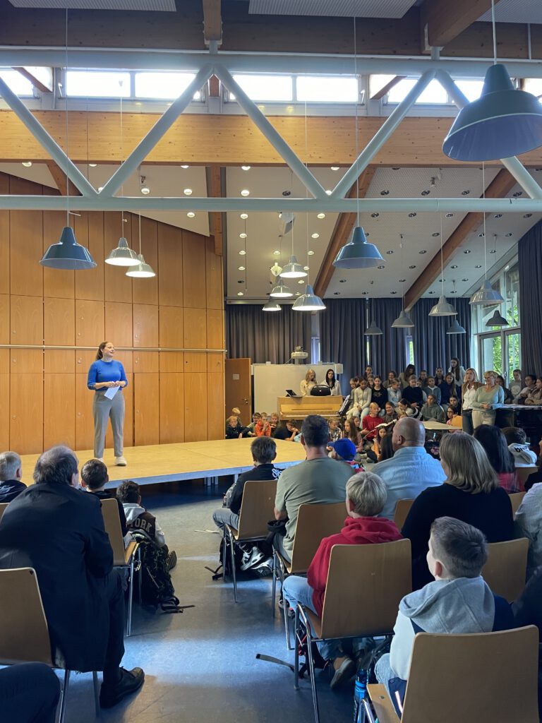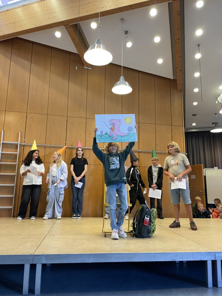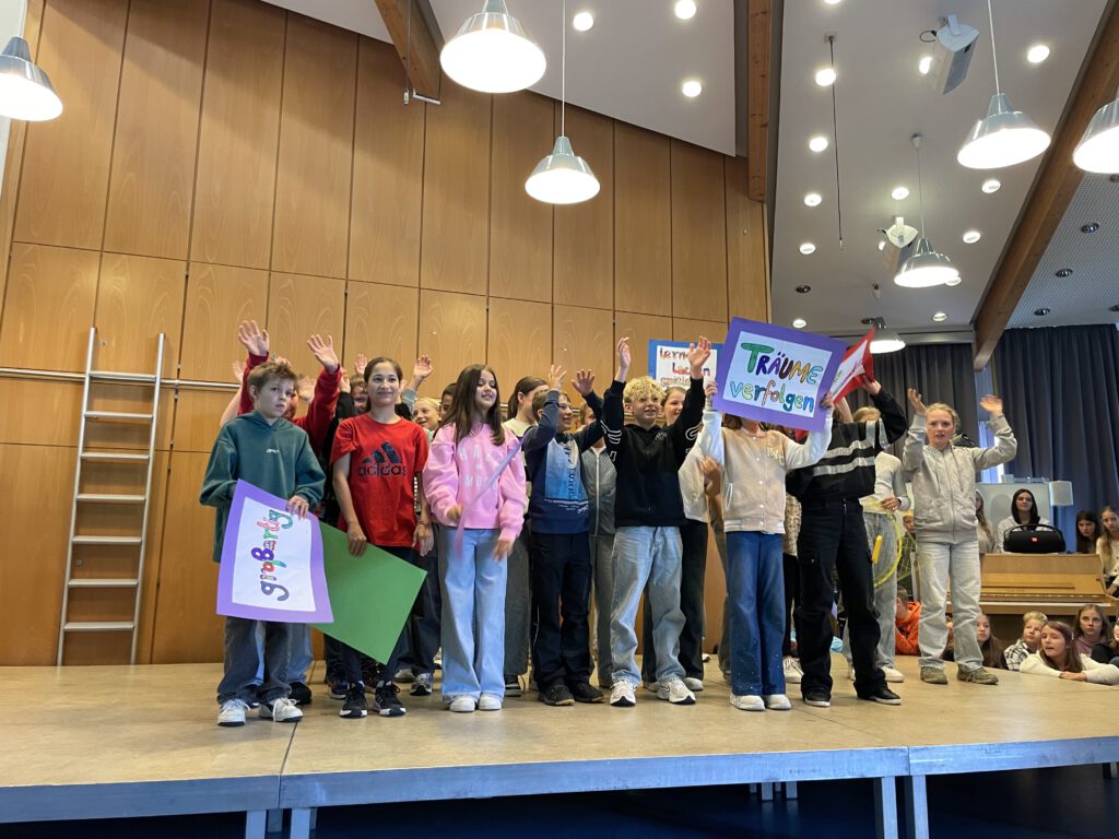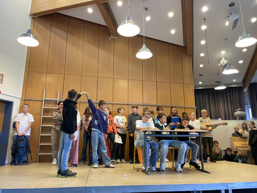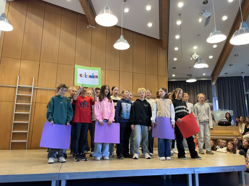 Am Dienstag wurden die neuen Fünftklässlerinnen und Fünftklässler feierlich an der Schule aufgenommen. Der Tag begann mit einem Gottesdienst unter dem Motto „Einer für Alle – Alle für Einen!“, an dem einige der neuen Schülerinnen und Schüler zusammen mit ihren Familien teilnahmen. Im Anschluss gestalteten die sechsten Klassen die Einschulungsfeier in der Aula. Dabei präsentierten sie ein buntes Programm mit einer szenischen Lesung „Der Streik der Farben“, einem Kurztheater, einem englischen Rap sowie musikalischen Beiträgen des Schülerchors und der Ukulele-AG.